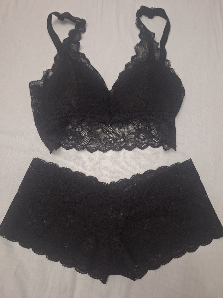Siyah renkte, gotik tarzda dantelli sütyen ve mini şort takımı, ayarlanabilir askılarla rahat kullanım sağlar.