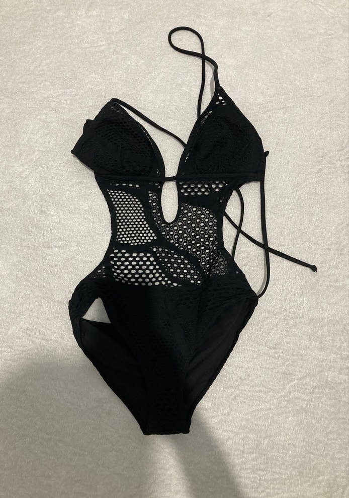 Dantelli ve askılı, vücuda oturan siyah gotik kadın mayo. Midi boy, plaj için uygun.
