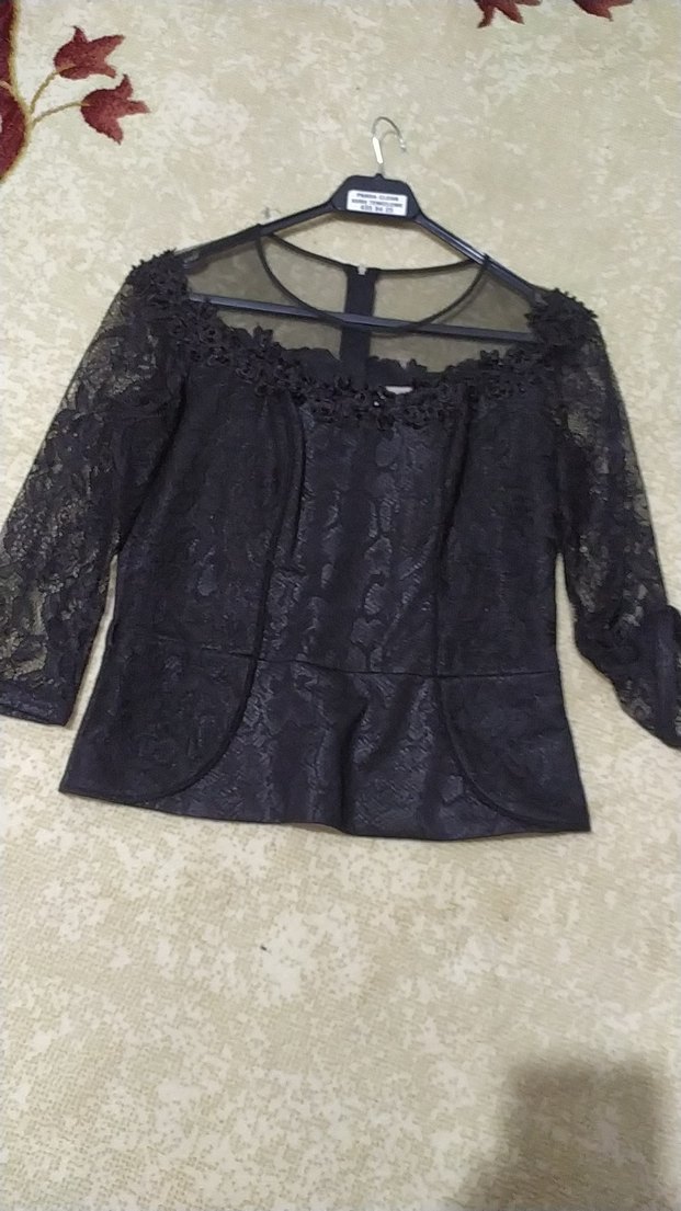 Siyah dantelli uzun kollu goti etek bluz, tekne yaka ve kısa boyda. Klasik şıklık ve koyu renkte, düğünsüz tarzda uygun.