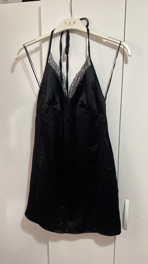 Satenimsi kumaştan yapılmış, halter yaka ve ince askılı, dantelli detaylara sahip siyah, vücuda oturan mini uzunlukta göğüs korsesi.