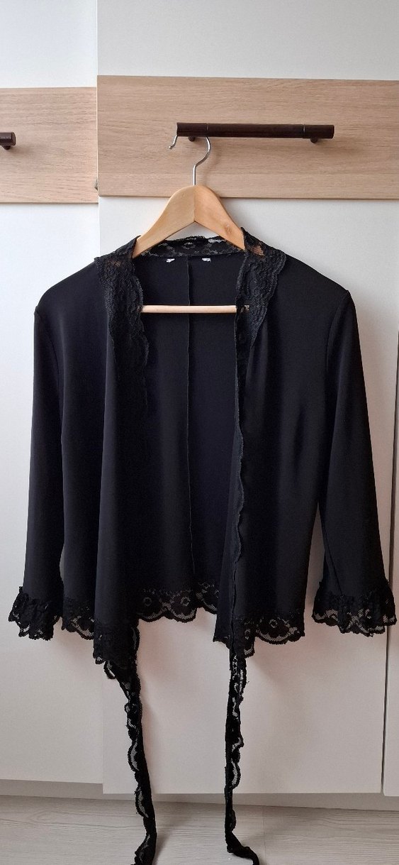 Siyah, dantelli ve 3/4 kollu hırka, bolero, satenimsi kumaştan olup, klasik ve gotik tarzı birleştirir.