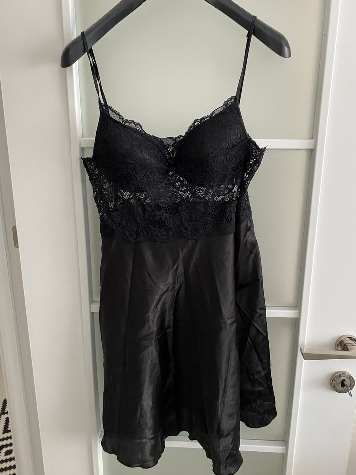 İnce askılı, dantelli üst kısmı ve düz siyah kumaşıyla, gotik stile sahip oturan midi gecelik. Hiç kullanılmadı