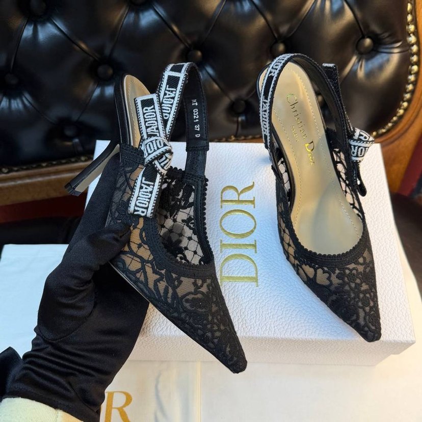 Nakışlı dantel ve JADIOR yazılı bantlara sahip siyah stiletto topuklu ayakkabılar. Cesur, gotik tarzıyla Paris şıklığını düğünlere taşıyor.