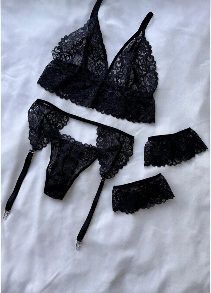 Kısa kesim, siyah dantel gotik sütyen, jartiyer ve bileklik seti. Dantel detayları ve desen içermeyen tasarımıyla dikkat çeker. S-M/L-XL/2XL MEVCUTTUR ✨