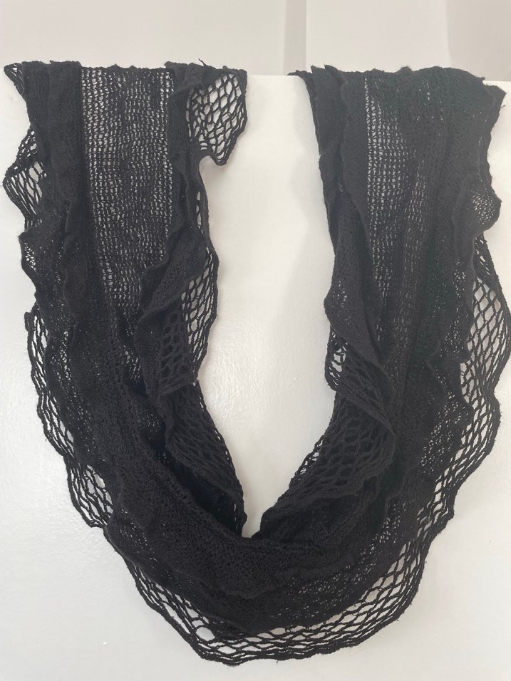 Siyah örgüden yapılmış, dantel detaylı kadın şalı, gotik ve avangart tarzı yansıtır. Trend belirleyenler için karanlık ve şık bir görünüm sunar. Siyah çok kullanılmadı göründüğü gibi