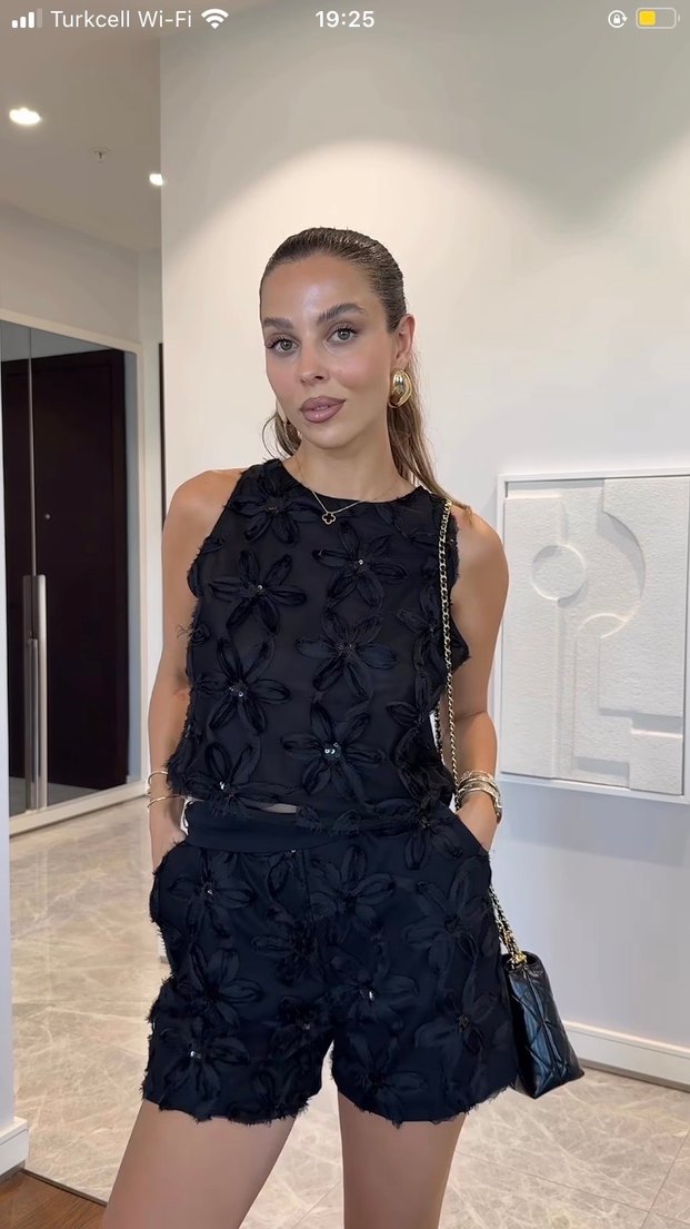 Siyah mini kısa şort, nakışlı dantel detaylarıyla bol kesim, askısız ve kolsuz tasarıma sahiptir. Sentetik kumaştan, romantik akşamlar için uygun, sokak modası ve ışıltılı tarzı birleştirir. ✨