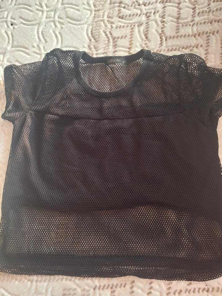 Siyah, dantelli ve kısa kollu, yuvarlak yakalı, file görünümlü sentetik kumaştan kadın üstü. Gotik ve atletik tarzı bir arada sunar.