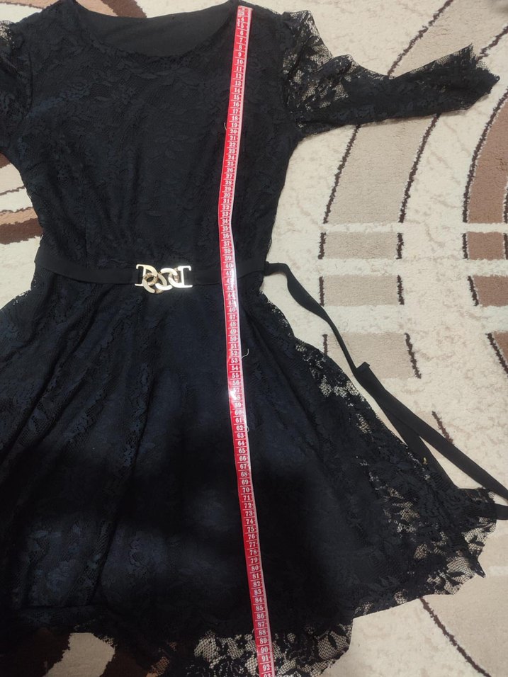 Siyah, desenli dantel kumaş ve üç çeyrek kollu, vücuda oturan midi elbise. Klasik şıklığı gotik detaylarla buluşturur, parti için uygundur. 89 uzunluğu 40 cm bel kısmı bir defa giyildi temiz