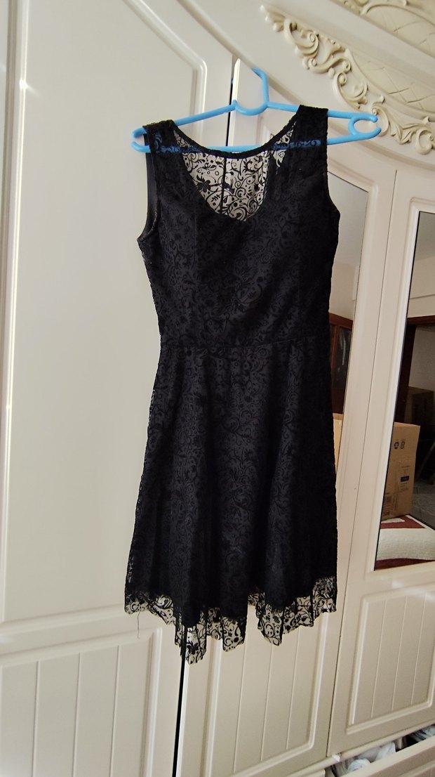 Siyah, dantelli, v yaka, kolsuz, midi boy, klasik gotik şıklığı yansıtan abiye elbise.