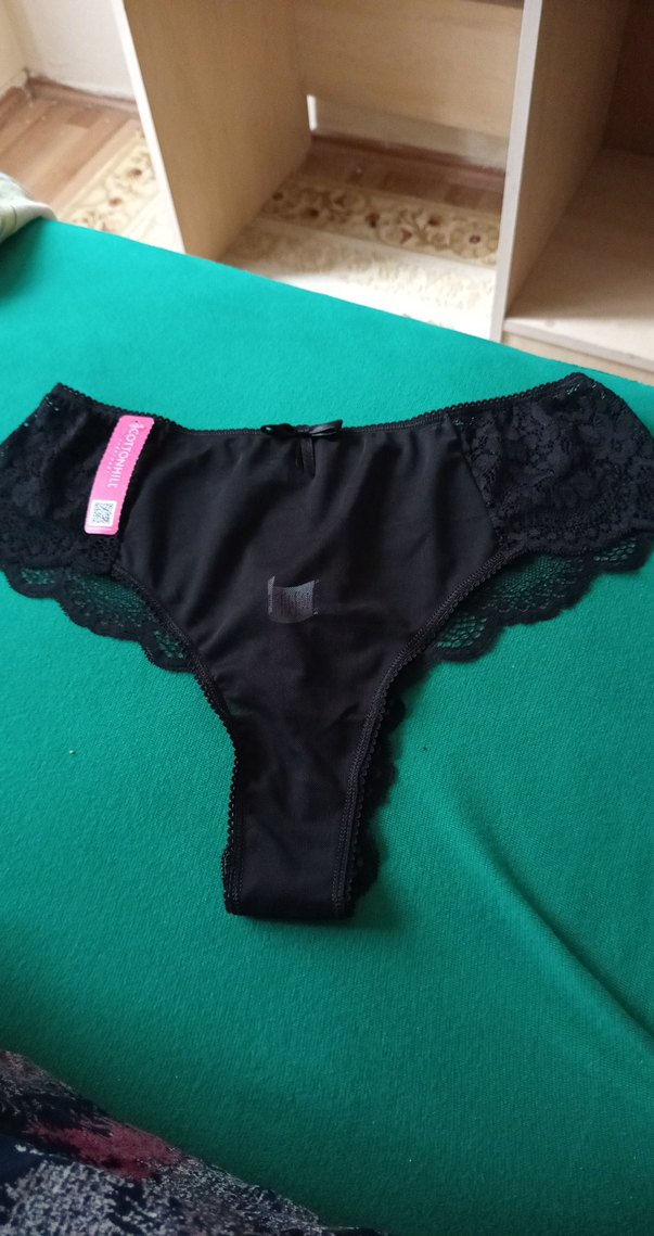 Siyah renkte, dantelli detaylara ve küçük fiyonk süslemeye sahip midi uzunlukta kadın külot. Gotik tarzda, desensiz ve rahat.