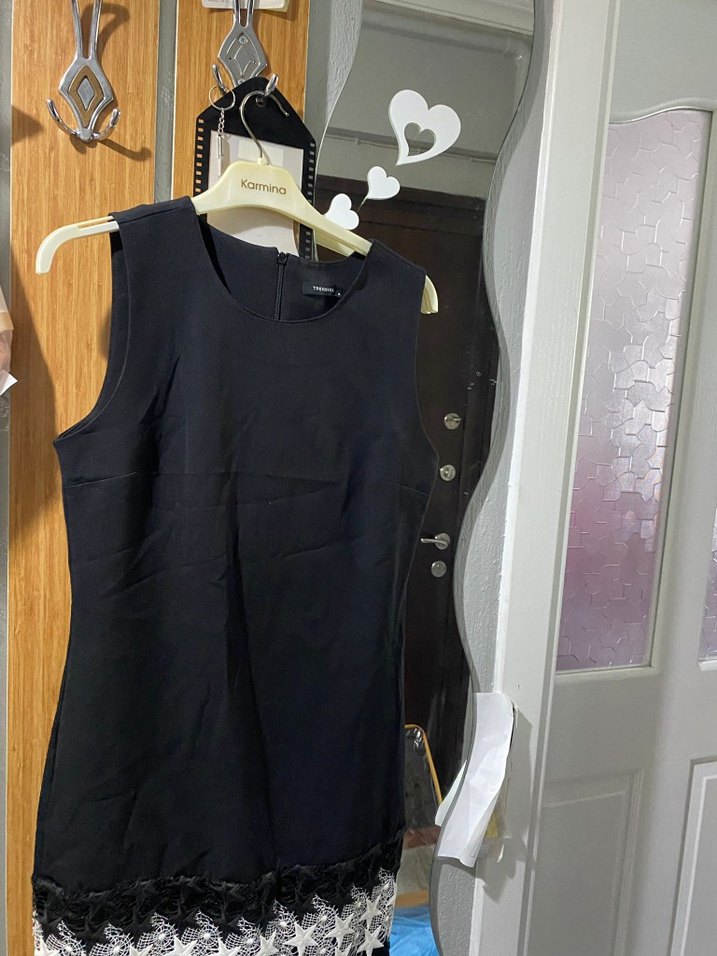 Kolsuz, yuvarlak yaka siyah midi elbise, etek kısmında dantel detaylı. Rahat kesimli ve gündelik şıklık sunan bir tasarım.