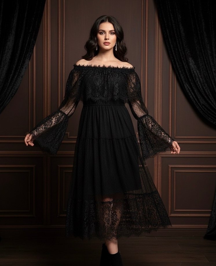 Siyah Dantelli Midi/Uzun Elbise-Gotik/Romantik Stil