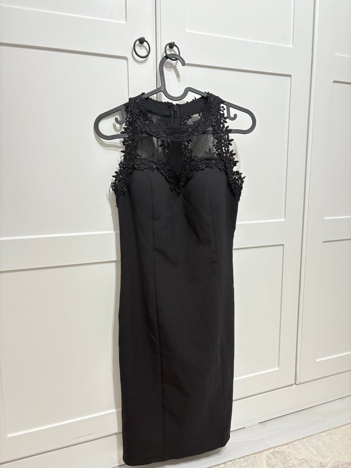 Siyah, dantelli işlemeli detaylara sahip, kolsuz, klasik şıklıkta midi elbise.2 kez giyildi. Arkasında ufak bir dantelinde kaçma var onu da ekledim. 38 beden fakat dar bi kalıbı var.