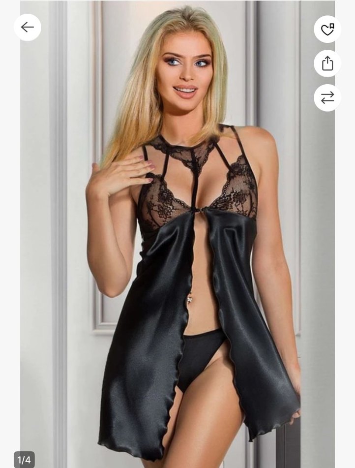 Siyah, dantelli ve saten dokulu kısa mini gecelik, ince askılı ve vücuda oturan kesime sahip. Gösterişli gotik tarzda.