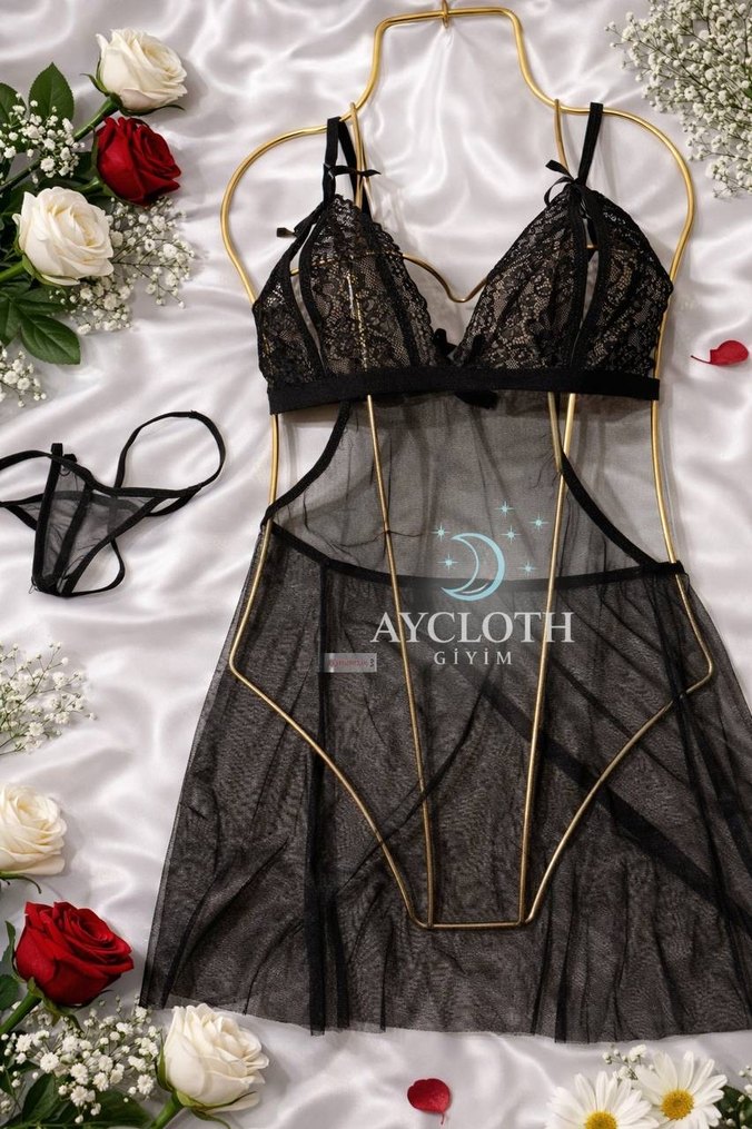 Siyah dantelli, askılı ve kısa boy gotik gecelik. İnce detaylarla ve transparan dokusuyla şık bir görünüm sunar.