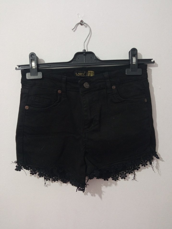 Siyah kot mini şort, bol kesim, nakış detaylı ve etek ucu dantel süslemeli. Trendy gündelik tarz için uygun.