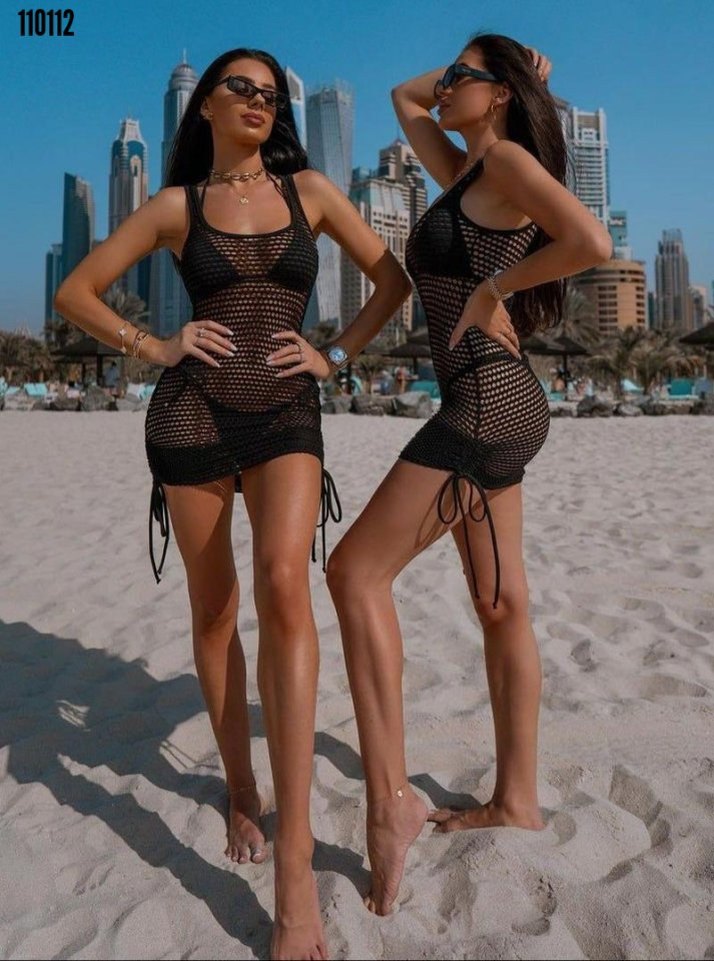 Siyah, dantelli, kısa ve vücuda oturan mini plaj elbisesi. İnce askılı ve desen içermeyen yapısıyla cesur sokak stiline uygun.