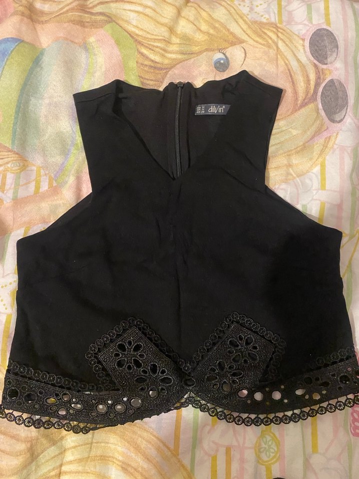Siyah, dantelli ve nakış işlemeli kısa mini yelek, V yaka ve kolsuz tasarımıyla gotik tarzı yansıtıyor. Cesur stil için uygun.
