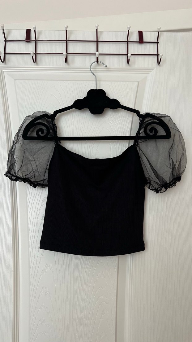 Siyah, straplez yaka ve transparan kabarık kollarıyla, keten kumaştan yapılmış, dantelli ve fitted kesim gotik bluz.