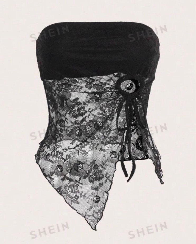 Siyah straplez bustiyer, parlak saten kumaş ve dantel detaylara sahip. İnce askılı kollu, midi boy ve vücuda oturan kesimle gotik parti stiline uygun. SHEIN markalı.