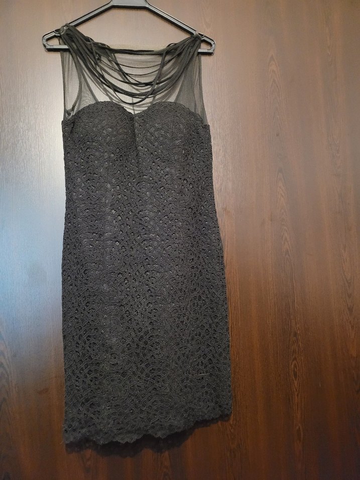 Siyah, dantelli ve straplez yaka detaylı midi abiye elbise. Üst kısmında şeffaf ve drapeli detaylar bulunur. Gotik tarz partiler için uygun bir kez giyildi şık tasarım