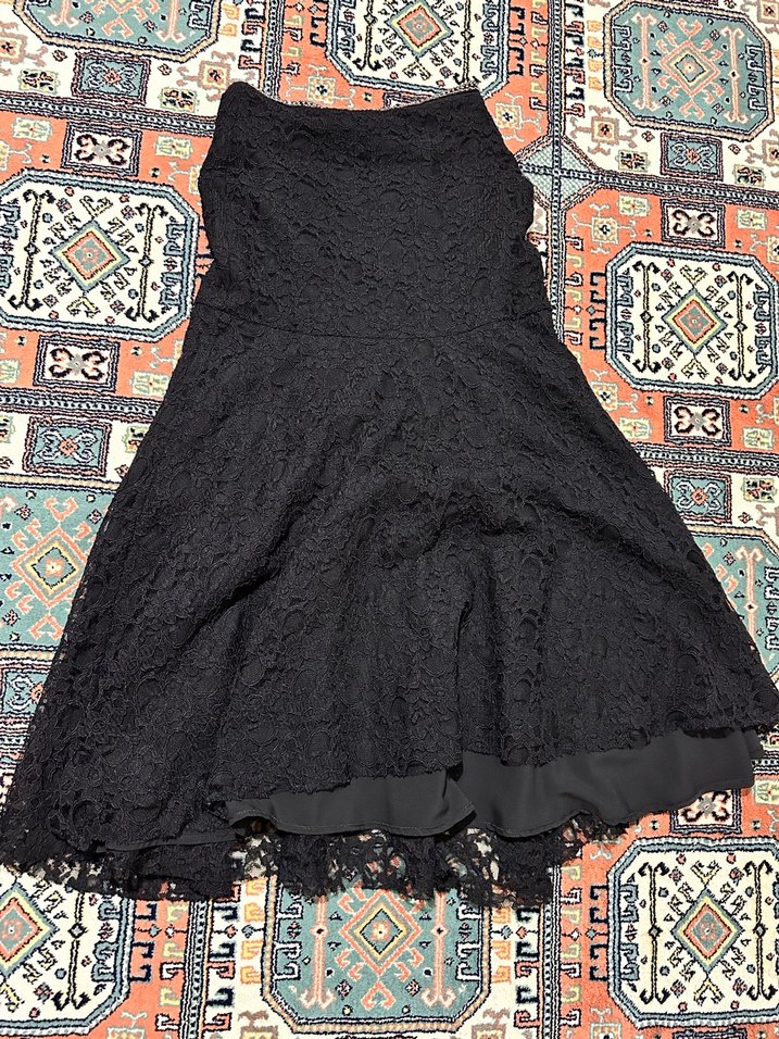 Siyah, dantelli uzun etek. Kalçaya oturan kesimi ve desenli yapısıyla gotik ve bohem tarzlara uygundur. Parti için ideal.