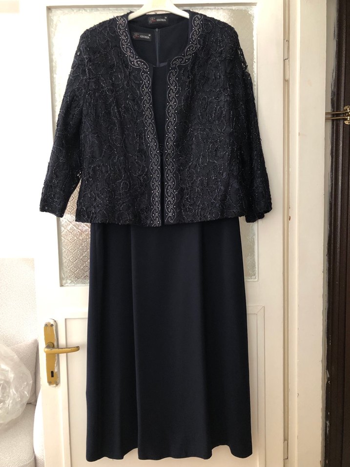 Siyah dantelli, uzun kollu, modern klasik tarzda, ofis için uygun kadın abiye elbise. Regular fit ve yakasında kesik yaka bulunur.
