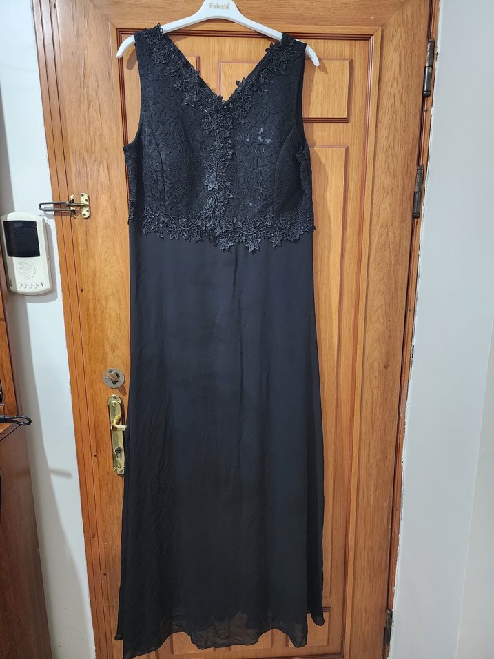 Uzun siyah abiye elbise, V yaka ve kolsuz tasarıma sahip olup, üst kısmında dantel detayları bulunur. Düz ve klasik kesimle düğünlerde kullanılabilir.