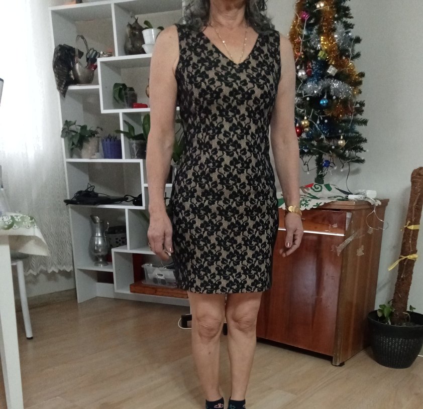 Siyah renkte, dantelli ve V yaka kesime sahip, kolsuz ve vücuda oturan midi elbise, klasik ve şık bir görünüm sunar.