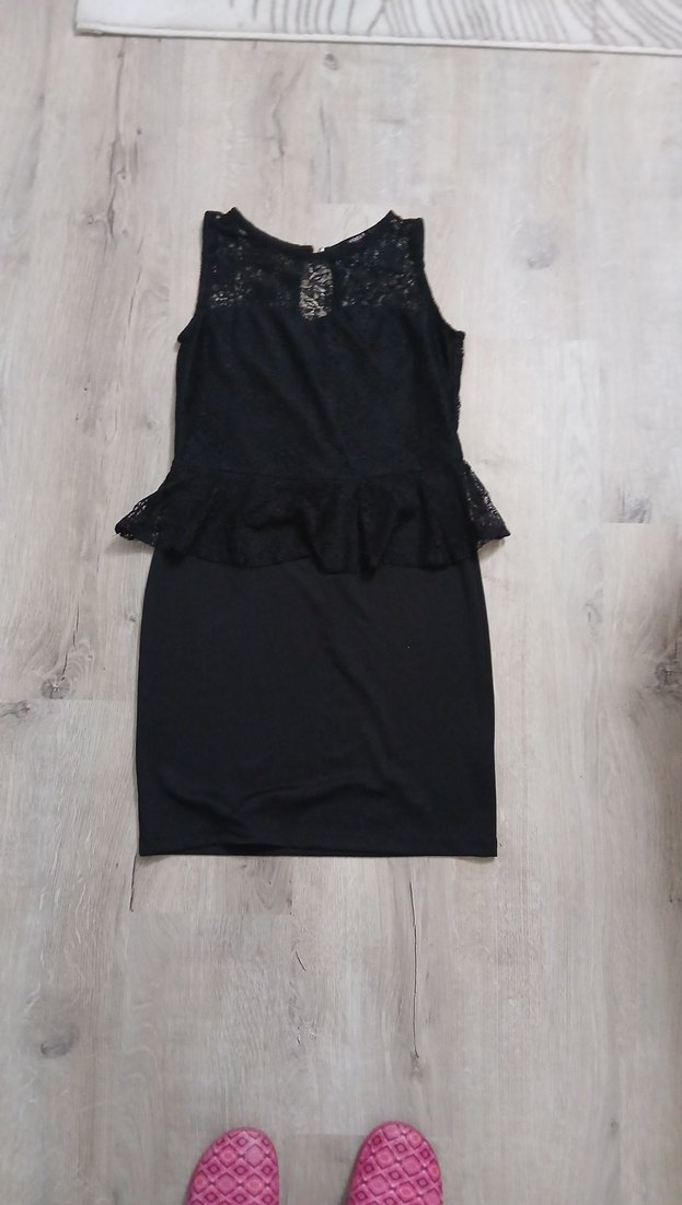 Siyah, v yakalı, kolsuz ve beli volanlı gotik tarzda mini elbise. Ofis kullanımına uygundur.