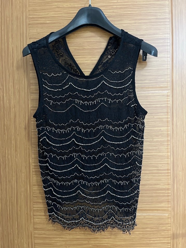Siyah, kolsuz ve V yakalı bu bluz, ince dantel işlemeleriyle öne çıkar. Yumuşak örme kumaştan yapılmış, trend günlük stil için uygundur.