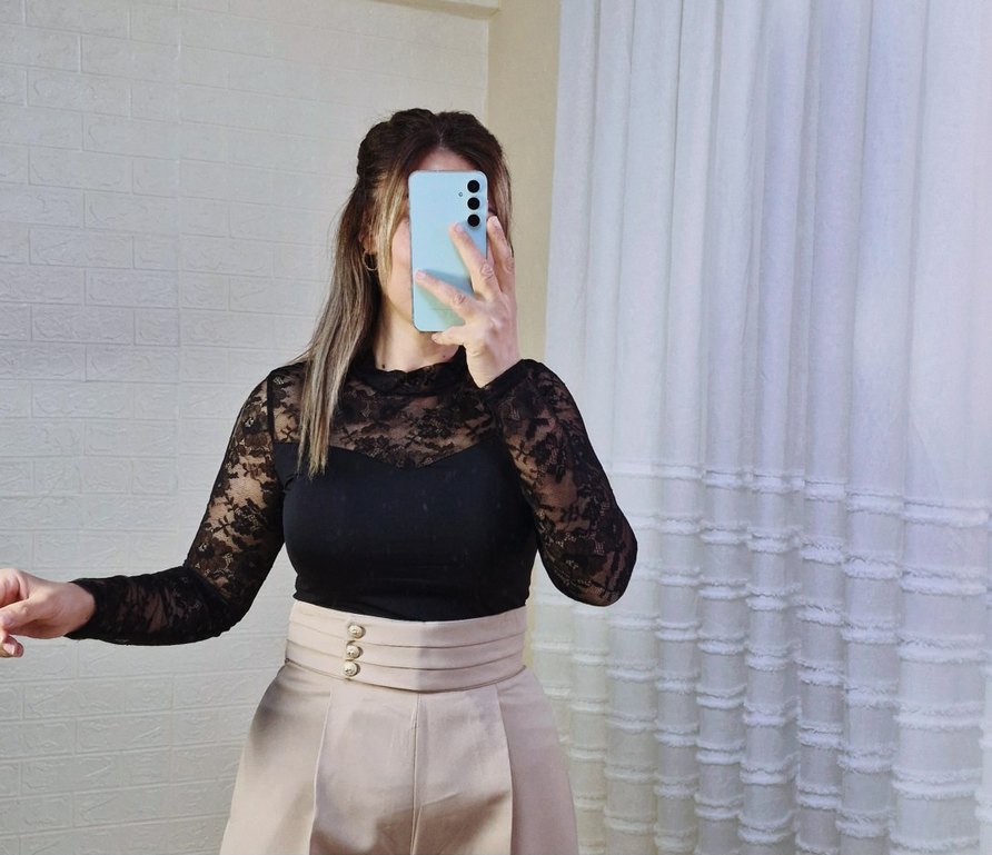 Siyah renkte, yüksek yakalı ve uzun dantelli kollu, vücuda oturan kadın bluz. Dantel detaylarıyla şık ve günlük kullanıma uygun bir model.