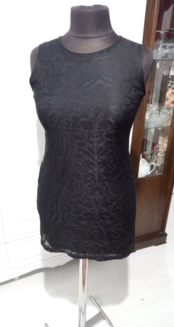 boy 87 cm göğüs 46 cm bel 42 kalça 48 cm Kolsuz, yüksek yakalı, dantelli siyah midi elbise. Vücuda oturan kesimi ve gotik tarzıyla