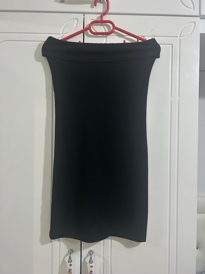 Siyah dar kesim ve düz yapısıyla minimalist goth tarzını yansıtarak günlük şıklık sunar. Straplez elbise