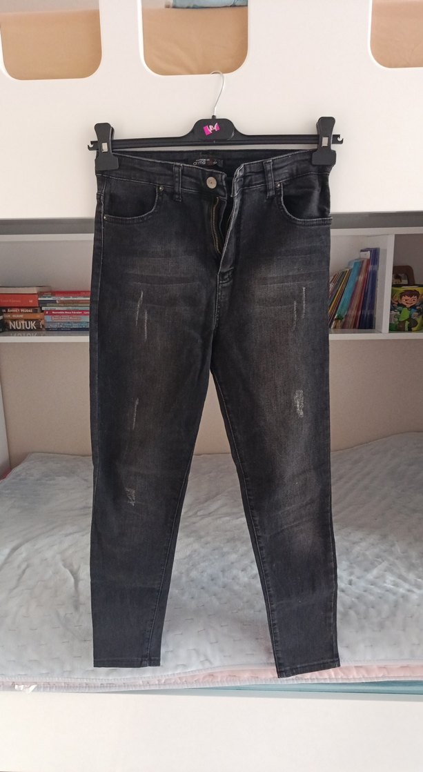 siyahrenkte, dar kesim ve tokalı detaylı midi uzunlukta kadın denim pantolon. Desensiz ve günlük rahat kullanıma uygun.