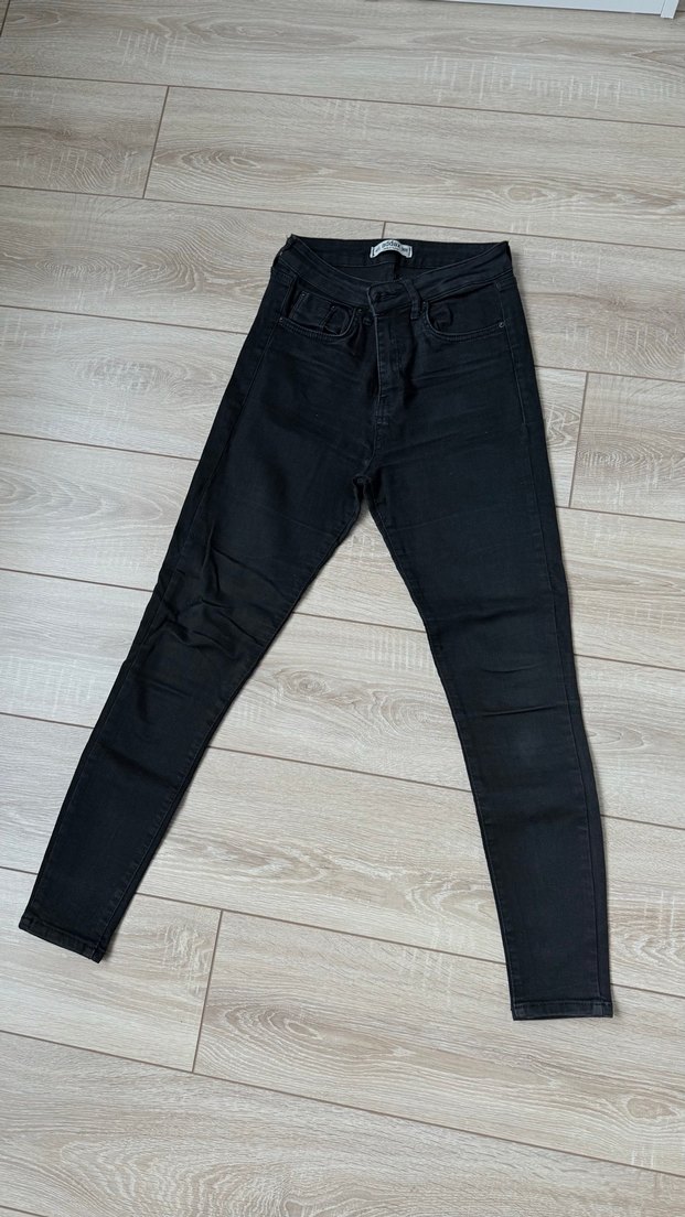 Dar kesim, siyah denim pantolon normal boyda ve desensizdir. Günlük sokak stiline uygun, zahmetsiz şıklık sunar.