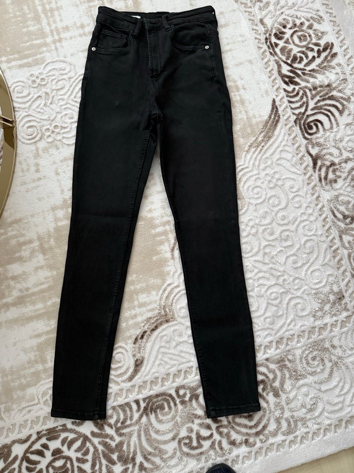 Siyah, dar kesim midi uzunlukta kadın jean, desen içermeyen ve sentetik kumaştan üretilmiş, rahat sokak stili için uygun. Hiçbir kusuru yok renginde veya kumaşında, sadece 1 kere giyildi ve hafif likralı.