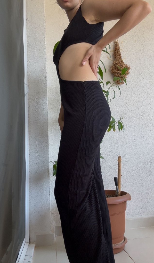Düz siyah,, askılı kol detaylı, yan dekolteli ve yırtmaçlı, dar kesim tulum. Pürüzsüz sentetik kumaştan, dış mekan sokak stili için uygun.