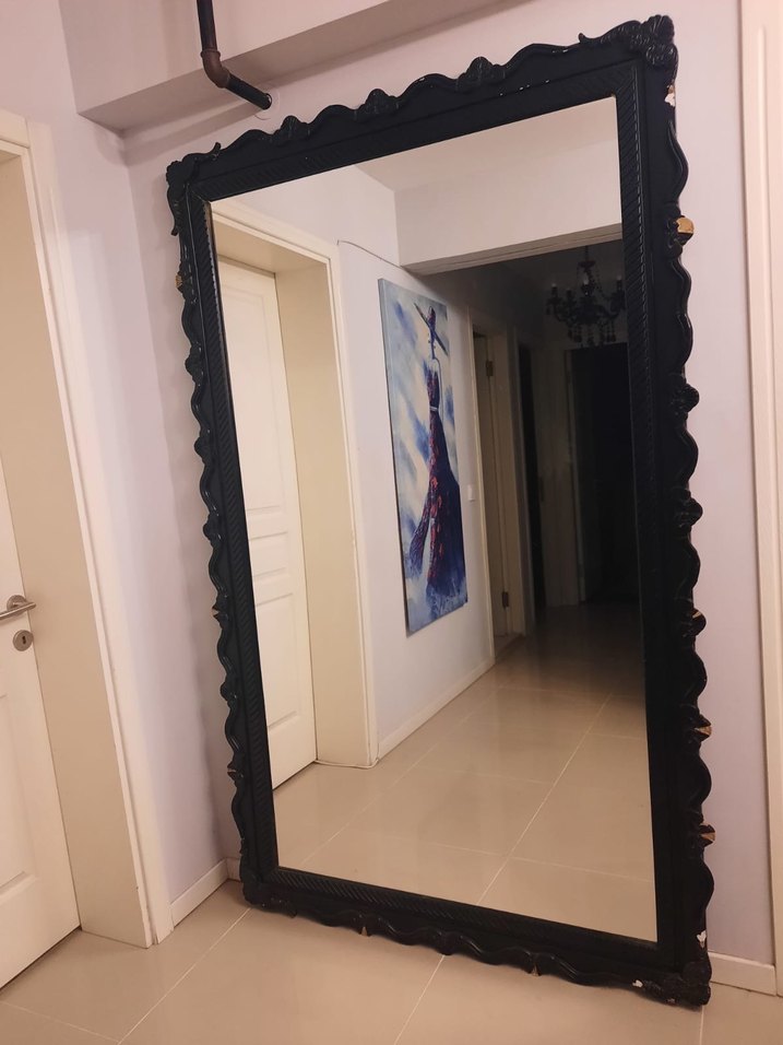 Detaylı siyah çerçeveli büyük boy dekoratif ayna, her odaya klasik bir dokunuş katar. Ahşap oymalı özel yapım çerçeve ve ayna 155*200 3 adet mevcuttur adet fiyatıdır