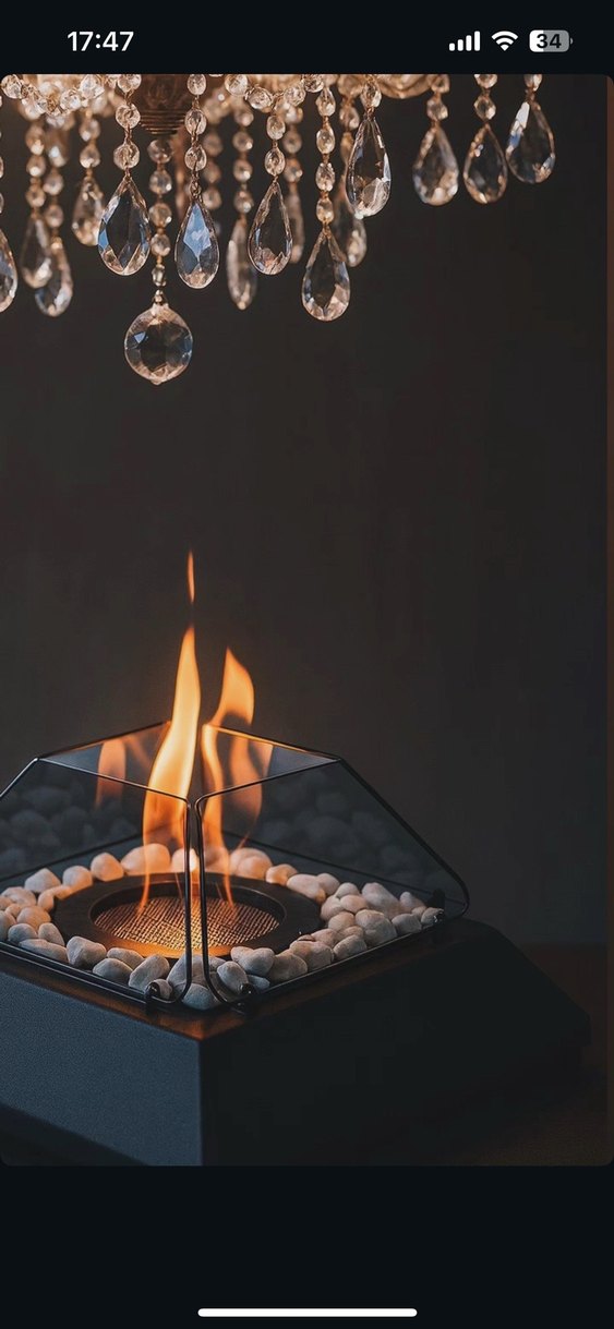 Siyah dekoratif cam mumluk, alevin etrafında beyaz taşlarla modern bir tasarıma sahip. ️