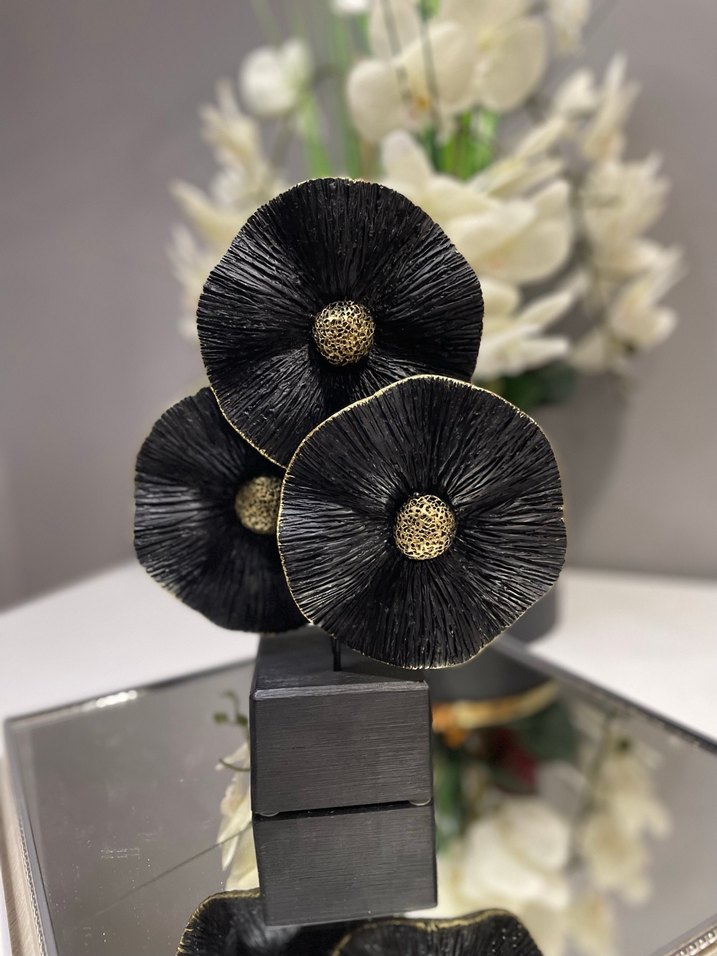 Dokulu yapraklı ve altın renkli merkezli üç siyah çiçekten oluşan dekoratif heykel, kare taban üzerinde ev dekoruna sanatsal bir dokunuş katıyor.