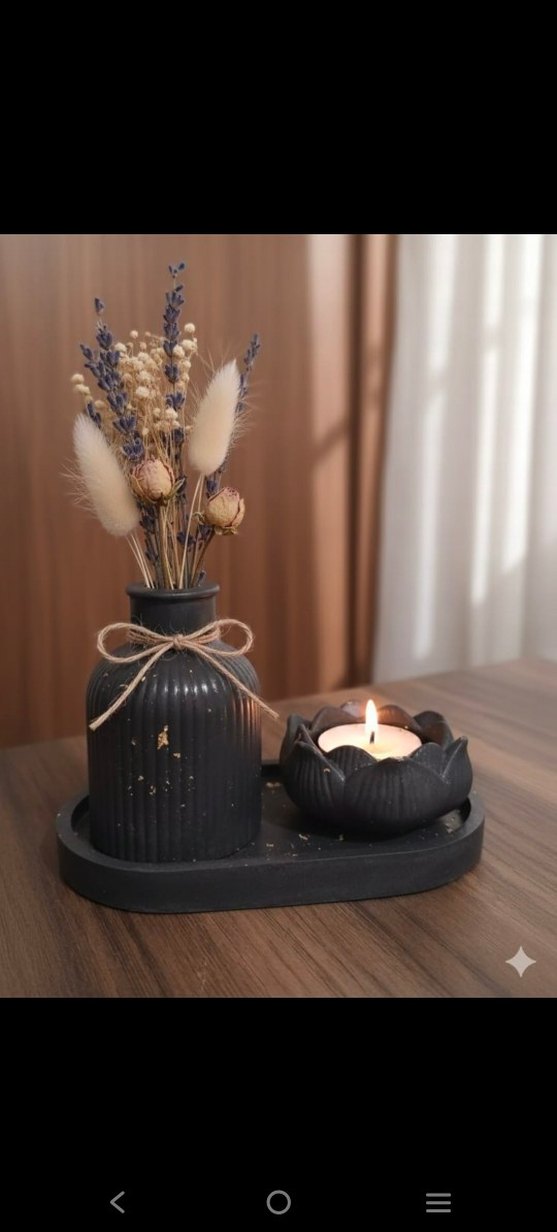 Kurutulmuş çiçeklerle siyah dekoratif vazo ve içinde yanan mum bulunan lotus şeklinde mumluk, siyah tepsi üzerinde yer alıyor. ️ çiçekler ve mum dahil değildir isteğe göre eklenir fiyat sorunuz