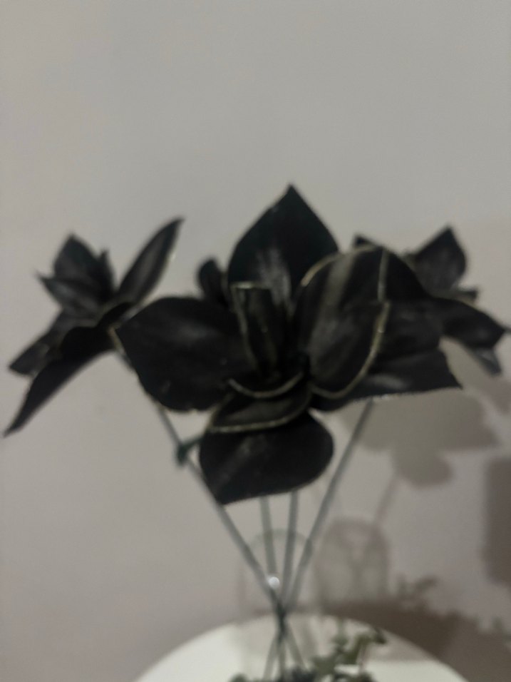 Detaylı yapraklara sahip siyah yapay çiçeklerden oluşan dekoratif set, ince saplarla düzenlenmiştir ve ev dekorasyonuna modern bir dokunuş katar.