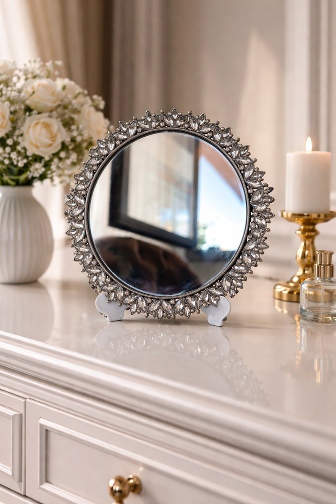 SiDekoratif taşlarla süslü ayna Mudo Consept ürünü hiç kullanılmadı yeni ve etiketli çapı 18 santim dekoratif çerçeveli yuvarlak masa aynası, her odaya klasik bir dokunuş katar.