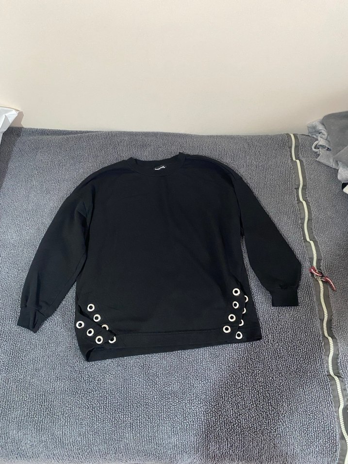 Siyah, uzun kollu, delik detaylı, yuvarlak yaka sweatshirt. Bol kesim ve normal boyda, yumuşak ve sıcak kumaştan, günlük rahat kullanım için uygundur.
