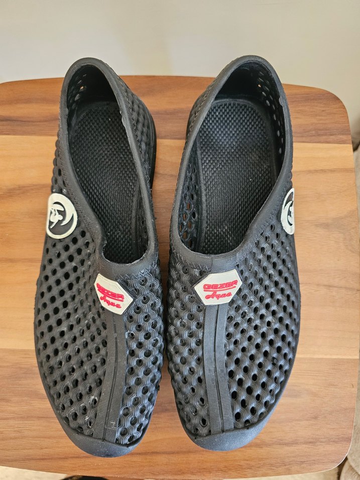 Siyah delikli kauçuk erkek su ayakkabısı, tokalı detaylarıyla günlük kullanım için rahat ve kullanışlıdır. 42 numaradır. eşim 42.5 23 giyiyor. bu yüzden 42 43 giyen birine olacaktir