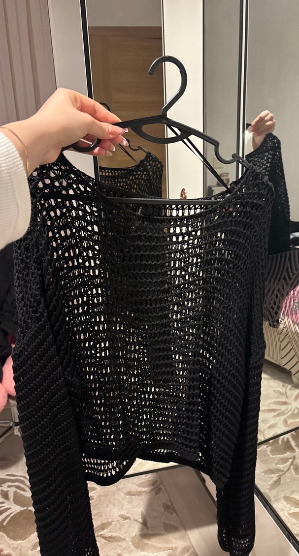 Bu siyah örgü kadın kazak, salaş kesim, yuvarlak yaka ve uzun kolludur. l beden defacto ürünüdür kollarında hafif deftormasyonlar var fotoğraflara ekledim