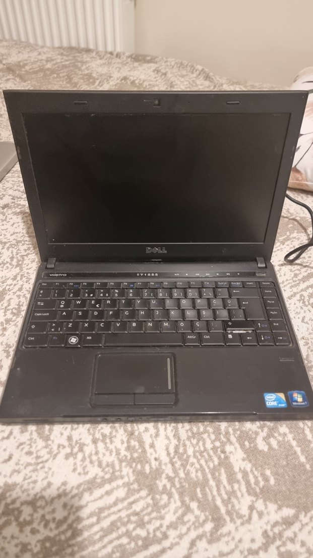 Bu siyah Dell dizüstü bilgisayar tam klavye ve dokunmatik yüzeye sahiptir. Palm rest alanında Intel Core i5 ve Windows 7 etiketleri bulunur.