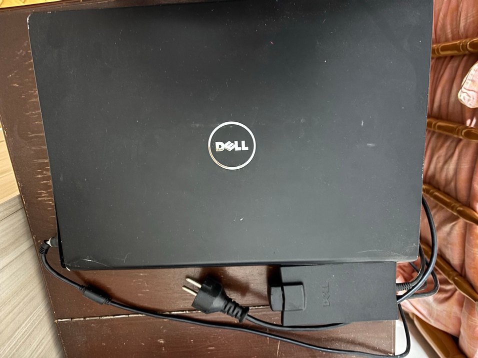 Dell logosu bulunan siyah renkli dizüstü bilgisayar ve güç adaptörü ile birlikte. Açma kapama tulu kırık görsellerde görülüyor