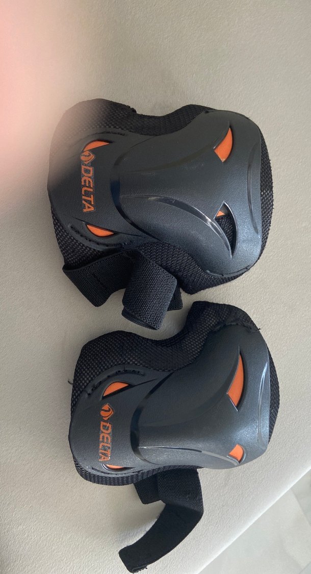 Siyah motosiklet diz koruyucuları, kauçuk koruma ve cırt cırtlı bantlara sahiptir. Delta logosu baskılı, biker tarzında. ️